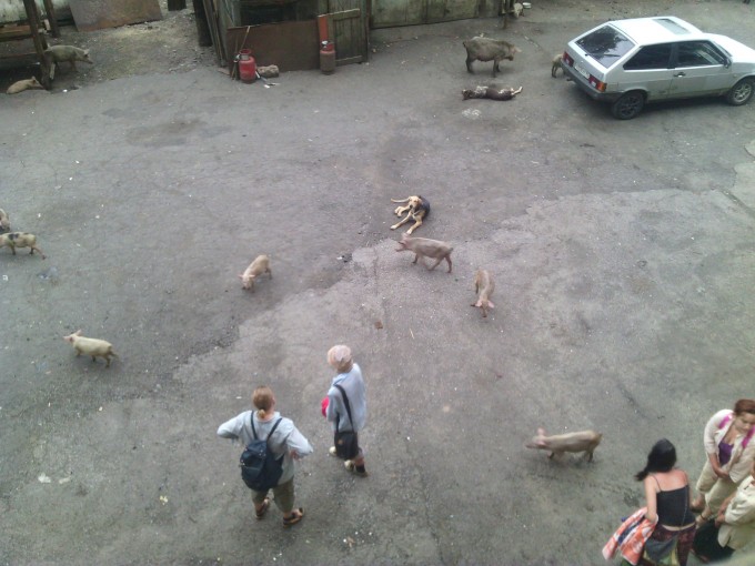 Питьевая и вообще единственный источник воды для нас, это спуститься вниз, на улицу (странно, что местные жители возмущались, когда много воды лили на землю, мол дом скоро подмоет совсем....(и зачем это говорить?)). Двери у подъезда нет, вместо неё сколоченная из досок решетка на петлях, чтобы не заходили свиньи, гуси и собаки. Свет бесплатный, провод кинутый на столб, со столба в подъезд, с подъезда в квартиры. Впервые получил удар током, когда кидал провода удлинителя, чтобы была розетка для зарядки мобильников.