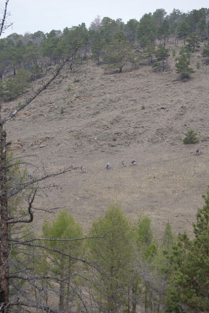 А вот туда надо спуститься. Люди в палатках внизу вытягивали шеи, явно не ожидая увидеть скатывающихся крутого лесного склона велосипедистов.