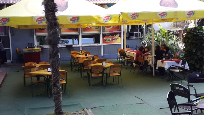 Едальня в Ялте - по принципу 2-в-1. Вдали видно кухню, где готовят. На столиках справа, со скатертями, обслуживание "кафе". На столиках слева, желтых, столовая - подходишь к кухне и ту же еду накладываешь себе сам и сам несешь поднос до столика. Разница в цене примерно полтора раза. ![]()