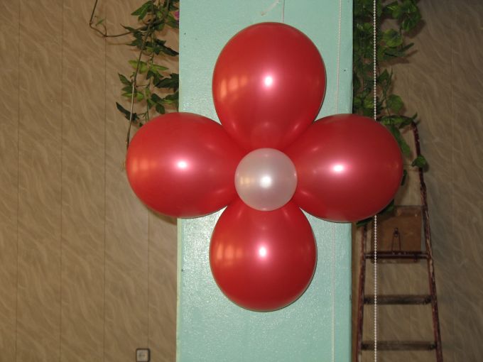 цветок из шаровНу а мы поговорим о простеньком. Цветок из шаров четырехлистный.![]()