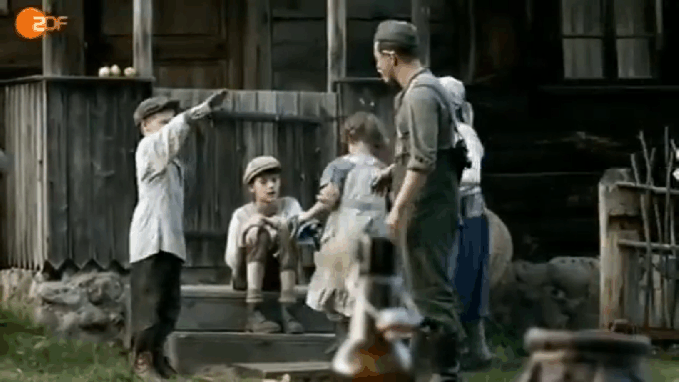 И вот немецкая девушка, плача, вырезает с группового фото еврейского друга. И вот немецкие ребята с боем берут в плен русских солдат, после чего, терзаясь, одного через силу расстреливают. И вот они играют с русскими детишками в селе, и детишки (у которых, по логике, отцы на той стороне фронта) кидают им радостные зиги.