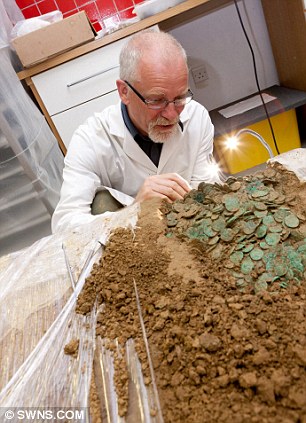Десятки тысяч золотых и серебряных монет слежались так, что напоминают огромный слиток весом в три четверти тонны.
