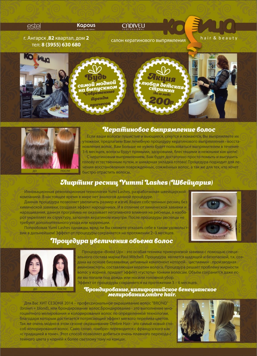 Первый профессиональный салон кератинового выпрямления волос "Корица". Мы можем превратить ваши пушистые, поврежденные, вьющиеся волосы в идеально прямые и здоровые! Эффект идеально гладких волос от 3-6 месяцев! Парикмахерские услуги. Большая супер-акция: женская стрижка от 250р, мужская 200 р, мелирование от 600, окрашивание от 300р, любая детская стрижка 150р! ( и это ещё не всё ) |