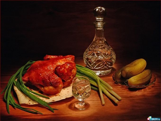У нас на фабрике в соединительном коридоре висит картина, называется "Хлеб с омулем". На данном натюрморте изображена буханочка хлеба, пара хвостов омуля и бутылочка "Столичной"(ещё из советских времен). Когда в день работал, идя в пятницу с работы, один взгляд на неё очень поднимал тонус, после трудной трудовой недели.