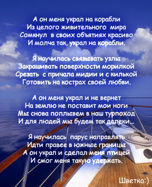 У меня не хватило сил Я любила твой странный мир Трогать глубже, до дна души Как птенцы с одного гнезда Я хотела сидеть на море |