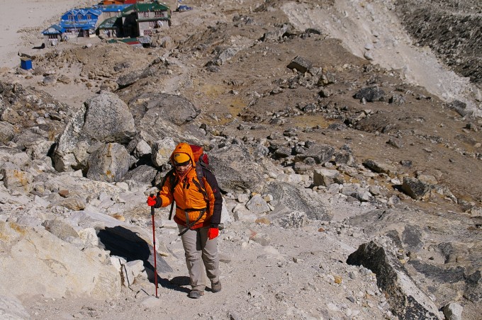 На фото - деревня Горак Шеп (5100), я иду по кусочку ледника. Не холодно, но очень ветрено и пыльно, поэтому укутана как мумия.