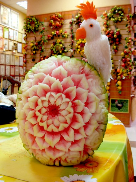 карвингКарвинг — англ. curving (от curve, что означает резать) — «резная работа», «резной орнамент». Карвинг в кулинарии — это фигурная резка по овощам и фруктам, которую сейчас широко используют повара самых разных ресторанов.