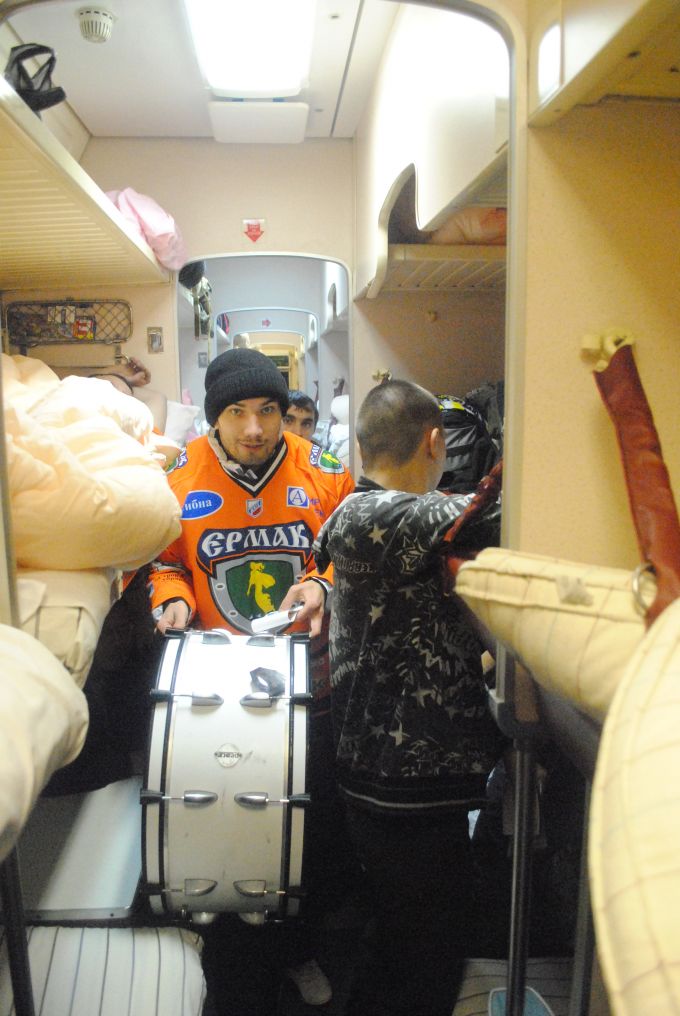 Благодаря тому, что билеты приобретались загодя, больше чем за месяц до дня икс, основная часть первой группы десанта расположилась в соседних секциях плацкарта. Сказать, что ехали весело — значит просто промолчать! Здорово! В момент были накрыты столики, и, зазнакомившись с теми кого не знали, мы, естесственно, приступили к торжественному возлиянию в честь.....да всего! Хоккея, «Ермака», новых знакомств, необычной поездки, России-матушки, березок-белоствольных, побед неминуемых! ХОККЕЙ СБЛИЖАЕТ! Всю поездку до Красноярска мы ходили друг к другу в гости, то по одному, то целыми блоками. Кстати, в ночь с 23-го на 24-е ноября, в вагоне №10 пассажирского поезда №339, состоялась презентация песни о «Ермаке», исполненной автором — Юрой Капустиным. Душевная, аж мурахи по коже — обязательно выложу видео, любезно предоставленное Максимом Бурилиным!