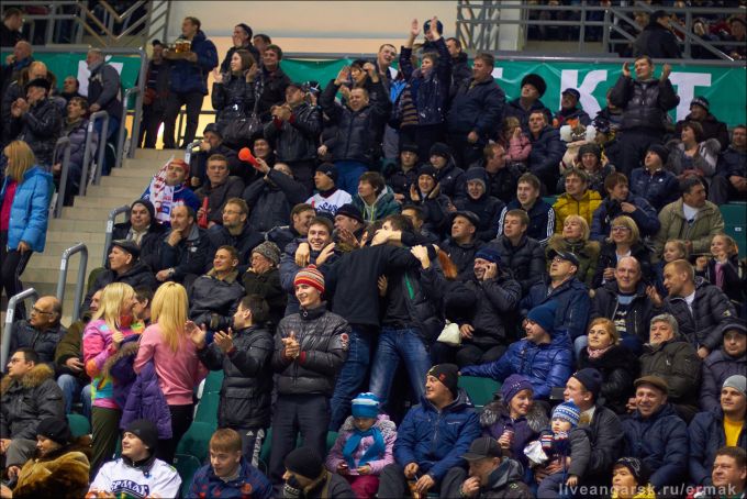 Практически полные трибуны семитысячной арены "Ермака", скрестив пальцы и сжав кулачки, вступили в игру вместе с хоккеистами. "Ермак!", "Вперед, Ермак!", "Нам нужна сегодня победа!" - болельщики не прекращали поддерживать любимую команду ни на минуту! С самых первых секунд в бой вступили, и барабаны, и дудки!