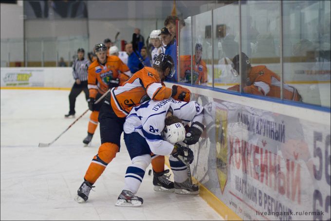 Второй период «Ермак» начал вчетвером, не прошел еще штраф у Никонорова. Гости создают пару острых моментов у ворот Гаврилова. «Рязань» обескураженной не выглядит, хоккеисты руки не опустили, играют по-боевому. И даже оставшись в меньшинстве, сумели огрызнуться по-настоящему! На 30-й минуте маленький Мухин убежал по левому флангу, продавил, именно продавил, двух оранжевых гигантов и бросив низом, испортил сухую статистику Гаврилову - 1:4. Хозяева через минуту попробовали ответить, Подшендялов с Золотухиным выехали 2 в 0 , но Николай не использовал продуктивно пас Артема. Сибиряки атакуют, терзая оборону гостей, но Трифонов держит свои ворота на замке. Неплохую комбинацию разыграли в начале последнего периода Чемерилов и Юшков, но результативной она не стала. На 46-й минуте за симуляцию удаляют Романа Смирнова, и рязанцам понадобилось 59 секунд, чтобы зажечь красный фонарь за воротами ангарчан во второй раз. Шайба на счету Арсения Кардаильского, грамотно подправившего бросок товарища на пятаке - 2:4. Отквитав две шайбы, хоккеисты с берегов Оки продолжили штурм, и через 4,5 минуты праздновали успех в третий раз! Рановато стали почивать на лаврах игроки «Ермака». Ждахин берет тайм-аут, меняет Гаврилова на Иншакова, который вступает в игру сразу, без раскачки. Мотивационная составляющая у «Рязани» зашкаливала,появился реальный шанс вытащить безнадежно проигранный матч (как казалось в начале). В таких случаях силы удесятеряются. В конце встречи, включив скорость, заиграли оба коллектива. «Ермак» дотерпел, ну а «Рязань» уезжает домой в огорчении, имея в багаже одно очко из девяти.