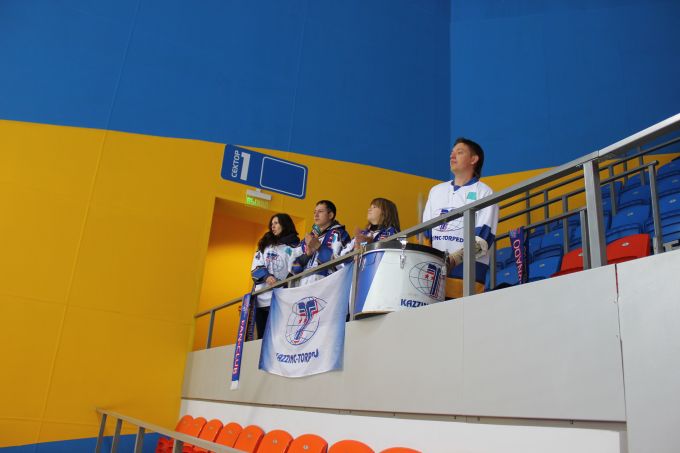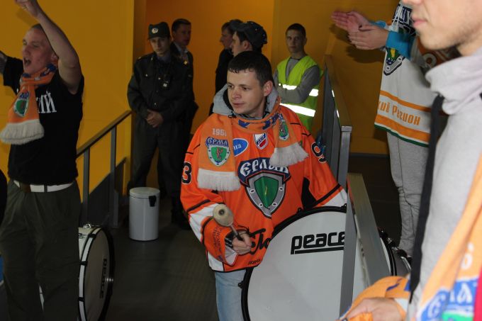 Взяв билеты заняли позиции на огневом рубеже. Готовились радоваться ВСЕМ голам и победе любой команд. Но голов, как известно, в данном матче просто не было. Ни одного. Определение номинального победителя в серии послематчевых буллитов не в счет. Скучнейший матч, который довелось видеть собственными глазами. Что бы совсем не уснуть пообщались с десантниками из Усть-Каменогорска. Лично мне понравилось в их группе два момента - барабан (легкий, с сочным звучанием, оформленный символикой клуба) и брюнеточка )) В плане зарядов и ритмов ничем не удивили. В этом плане большего внимания достоен фан-сектор "Сокола". У них тоже звучный барабан по которому они лупят с двух рук, что позволяет производить более динамичные, скоростные ритмы. Но вот в плане атрибутики они видимо решили не заморачиваться. В этом плане "оранжевые" вне конкуренции, нас ни с кем не спутаешь.