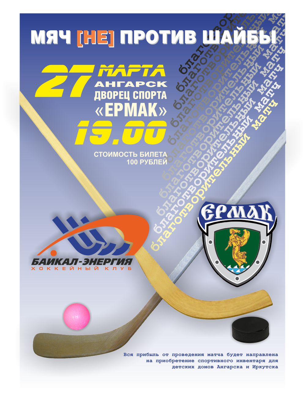 27 марта, в четверг, на льду большой арены дворца спорта «Ермак» состоится благотворительный матч по хоккею между командами «Ермак» (Ангарск) и «Байкал-Энергия» (Иркутск) под девизом «Шайба НЕ против мяча»!