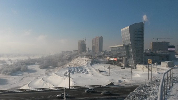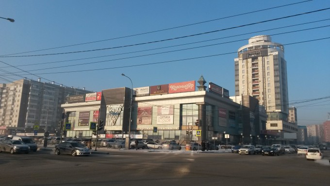День второй. К морозцу добавился довольно крепкий запах сгоревшего угля с местных ТЭЦ. Но прогулке по городу это не помешало, начал ее с посещения расположенного недалеко от гостиницы ТЦ "Июнь". Ничего особенного. По размерам примерно в 4-5 раз больше нашего "Фестиваля", суть примерно та же. Построен он непосредственно на берегу Енисея, залежалый товар можно сбрасывать прямо в воду