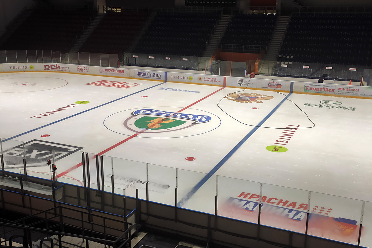 Идет подготовка ледовой площадки на большой арене дворца спорта «Ермак» к новому сезону. Вмораживаются рекламные баннеры, обновляется разметка игрового поля. Запланированные тренировочные матчи с красноярским «Соколом» решено провести именно здесь. Пусть зрителей не удивляет старый логотип в центре ледового корта.