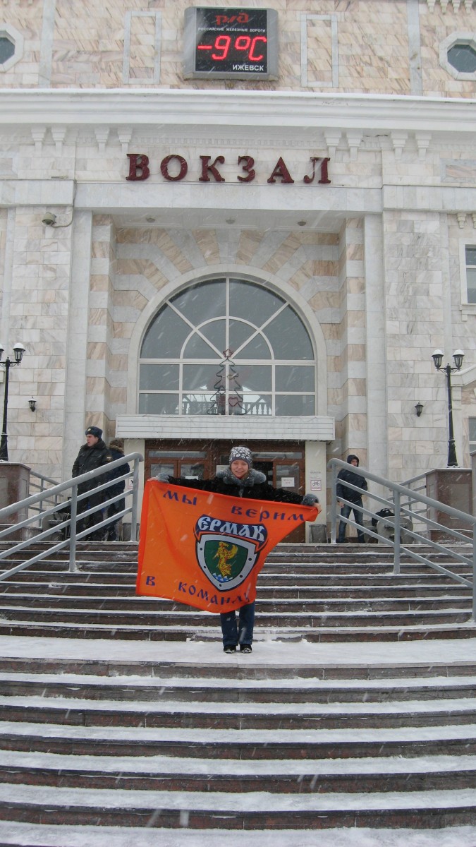 Прибыли мы в Ижевск в день игры. Было тепло и снежно, очень снежно, и, как следствие, движение пешеходов и транспорта было затруднено. Снег вроде и убирали, но эффекта от этого как-то не ощущалось. Даже, наверное, не «как-то не ощущалось», а «не ощущалось совсем».
