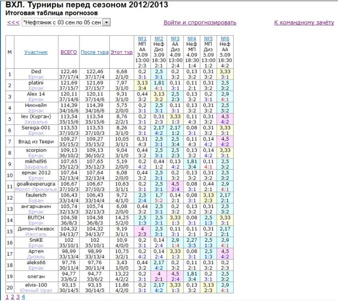 ( и это ещё не всё )Стартовал чемпионат прогнозов среди болельщиков ВХЛ. Удачно выступает команда прогнозистов Ермака. После 1-го тура мы лидируем с отрывом от преследователей в 7 баллов. Несколько неудачно стартовали чемпионы прошлого сезона. Южный Урал пока занимает 7-е место отставая от нашей 2-й команды более, чем на 1 балл. Но прошёл только 1-й тур. Это только начало и всё ещё на 100 раз изменится.