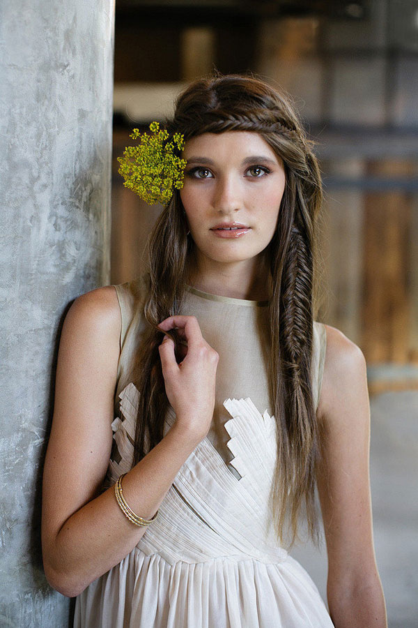 Свадебные стилисты рекомендуют плести косы: колоски, объёмную косу «рыбий хвост» или ободки из кос в бохо-стиле. Вместо фаты в таком случае идеально подойдёт венок из цветов или заколка-цветок.