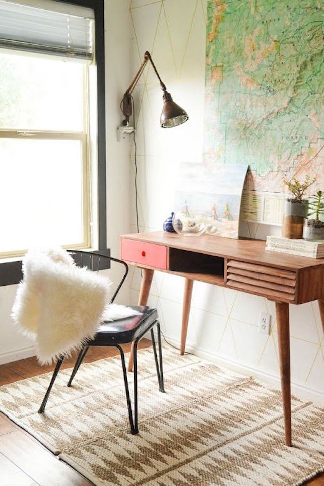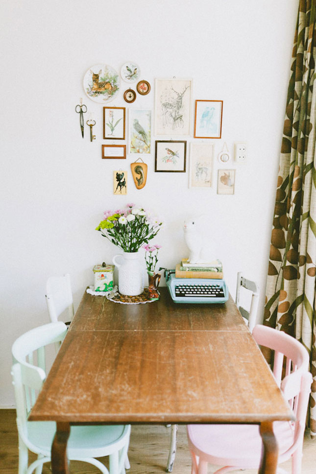 Ах, сколько воспоминаний может хранить такой потрёпанный, поцарапанный стол, за которым полвека назад собиралась вся семья чтобы не только поесть, но и чтобы поговорить (смартфоны ещё не были изобретены, эх, были же времена). Нежно-голубая пишущая машинка — трепетная мечта самого автора. Декор стены — выше всяких похвал. Всё вместе — очень уютная, по-семейному обставленная комната для чего угодно.