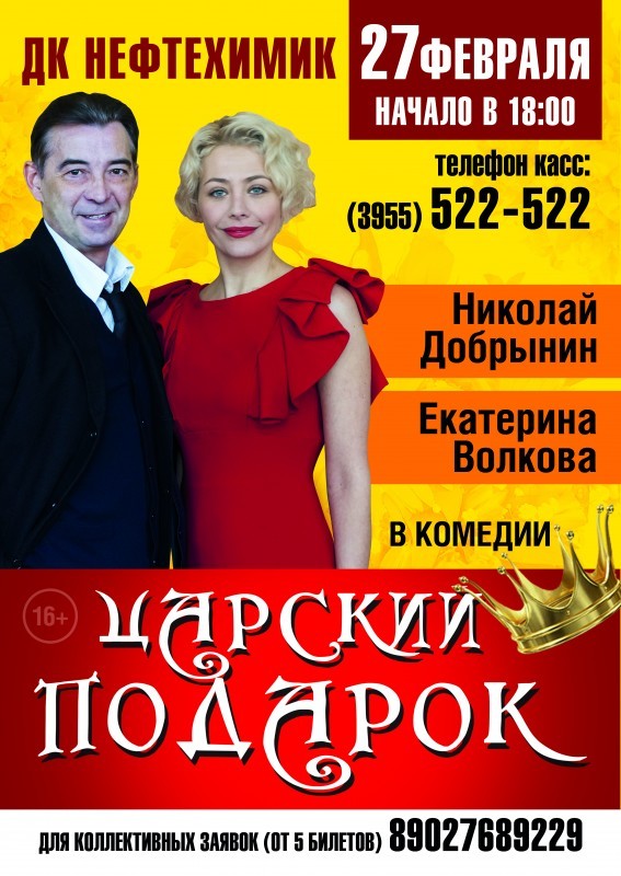 Лирическая комедия «Царский подарок» с участием актеров из Москвы Николая Добрынина и Екатерины Волковой. Спешите увидеть эту легкую, добрую и очень трогательную историю, которая станет для вас по-настоящему Царским подарком! Начало в 18:00, ДК "Нефтехимик".