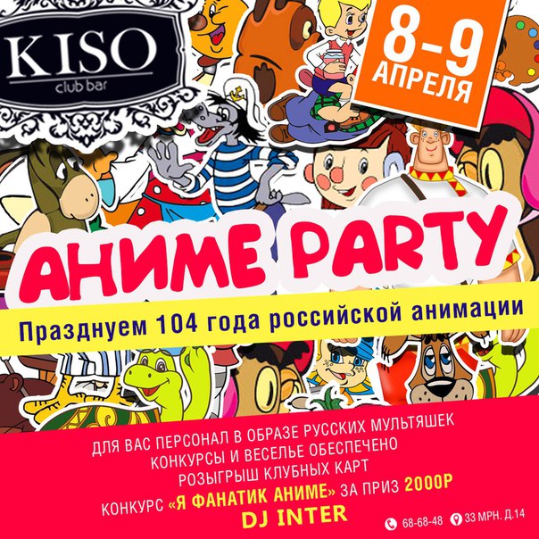 В эти выходные, клуб-бар Кисо превратится в центр анимированных героев советских мультиков, вы сможете сделать крутые “аватарки” с любимыми героями и оторваться до самого рассвета под лучшие сеты от Dj Inter! Розыгрыш подарков в конкурсах от MC Smoke и Анатолия Кюрса! А также вас ждет DEEP PRE-PARTY! С 22:00 до 00:00 Deep House от одних из лучших dj's Ангарска - Divine, Danny Burn! Информация по т. 686848.