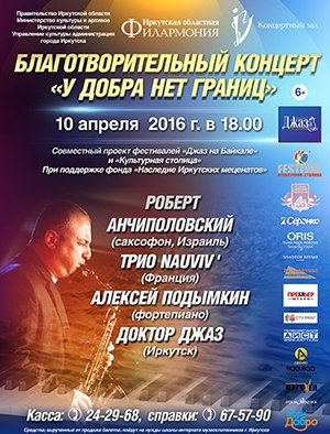 в рамках фестиваля «Джаз на Байкале» в Иркутской областной филармонии состоится благотворительный концерт «У добра нет границ». Исполнители — Роберт Анчиполовский (саксофон, Израиль), трио «Новив» (Франция), Алексей Подымкин (фортепиано), ансамбль «Доктор Джаз». Начало в 18:30.