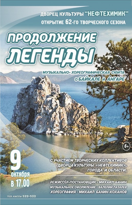 62-й творческий сезон откроет ДК "Нефтехимик" музыкально-хореографической сюитой о Байкале и Ангаре «Продолжение легенды» с участием творческих коллективов дворца. Режиссер-постановщик Михаил Бачин. Начало в 17:00.