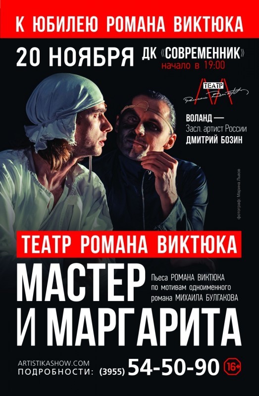 Театр Романа Виктюка покажет в Ангарске спектакль по произведению М. Булгакова "Мастер и Маргарита". Роман Виктюк, работая над пьесой по роману "Мастер и Маргарита", учел и политический контекст, и мотивы ранних редакций булгаковского текста. Это третье обращение режиссера к культовому для русской литературы произведению. По сравнению с предыдущими версиями, здесь меньше романтики и больше философского осмысления феномена сталинской эпохи. Начало в 19:00, ДК "Современник".
