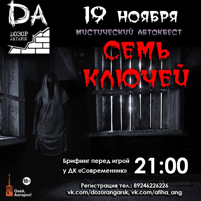 В эту субботу - необычный, завораживающий и мистический авто-квест Ночного Дозора – «Семь ключей». Дополнительный инвентарь: газета «Свеча» от 17.11.2016. Брифинг перед игрой в 21:00 на площадке у ДК «Современник». Начало игры в 22:00.