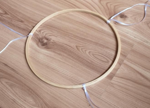 Вторую часть пяльцев украшаем тремя тонкими ленточками, прикрепив их узлом. Элемент вдеваем в первую часть пяльцев. Эти ленточки нужны, чтобы прикрепить всю конструкцию над кроваткой.