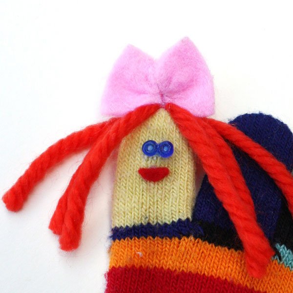Постепенно образы каждой куклы определяются. Их легко узнать по деталям: у девочки — бантик и длинные волосы, у мальчика — короткие волосы и кепка. С пышными усами — дедушка, правда, дети уже окрестили этого персонажа «профессором». Остальные двое — «снегурочка» и «сова». При желании добавьте больше деталей: воротнички, галстуки, юбочки, уши, крылья. Можно сделать перчатку тематической – подобрать персонажей одной сказки. А можно, как моём случае, положиться на фантазию и придумать сюжет с теми персонажами, которые собрались вместе случайно.