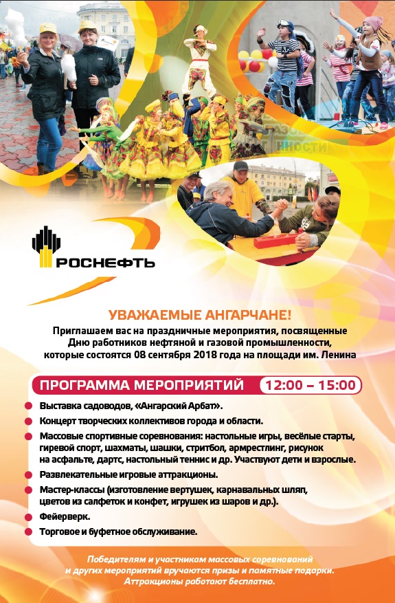 Национально-культурные объединения и общественные организации Иркутской области приглашают всех на культурно-спортивный праздник «Дружба народов Прибайкалья». Гостей ожидает дегустация национальных блюд, знакомство с национально-культурными объединениями, праздничный концерт, интерактивные площадки для детей и многое другое. Любителей спорта порадуют соревнованиями по бурятской борьбе «Бүхэ барилдаан», масс-рестлингу, шахматам, мини-футболу, кульминацией спортивной программы станет перетягивание каната. Место и время проведения: спортивная школа «Рекорд» (бульвар Рябикова, 13 Г). Начало в 12:00. Справки по тел.: 380-140