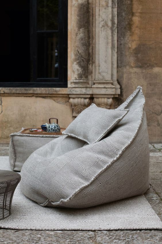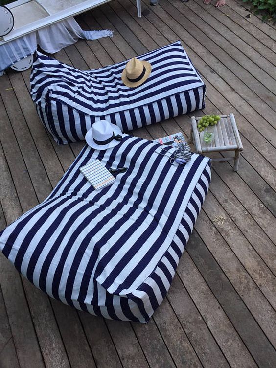 Цвета и текстуры также зависят от вас. Мы бы советовали выбирать большие кресла-мешки, чтобы они могли выступать не только стульями, но и шезлонгами. Если вы не можете найти подходящего кресла-мешка, сделайте его сами, в сети много уроков.