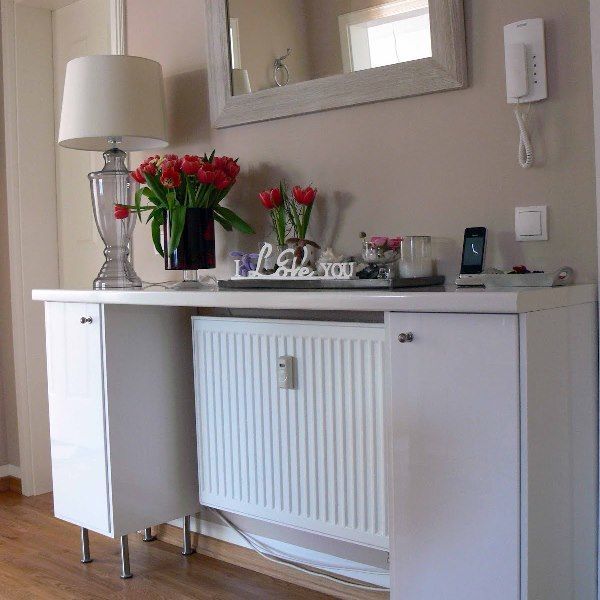 Более продвинутый способ — замаскировать радиатор под мебель. Например, под комод. Самостоятельно соорудить такую конструкцию довольно сложно, но ее можно заказать по вашему дизайну. Удивительно, но некоторые комоды сделаны так, что гости и не догадаются, что за ними скрывается батарея.