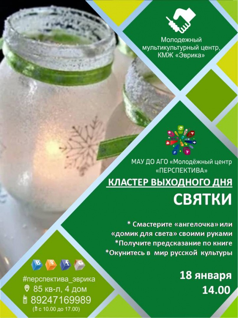 18 января с 14:00 молодёжный мультикультурный центр клуб "Эврика" (85 квартал дом 4, домофон 23) приглашает окунуться в атмосферу русской культуры. Вместе погадаем на исполнение желаний, изготовим своими руками подарки для друзей и близких, порадуемся и пошутим! Вход свободный.