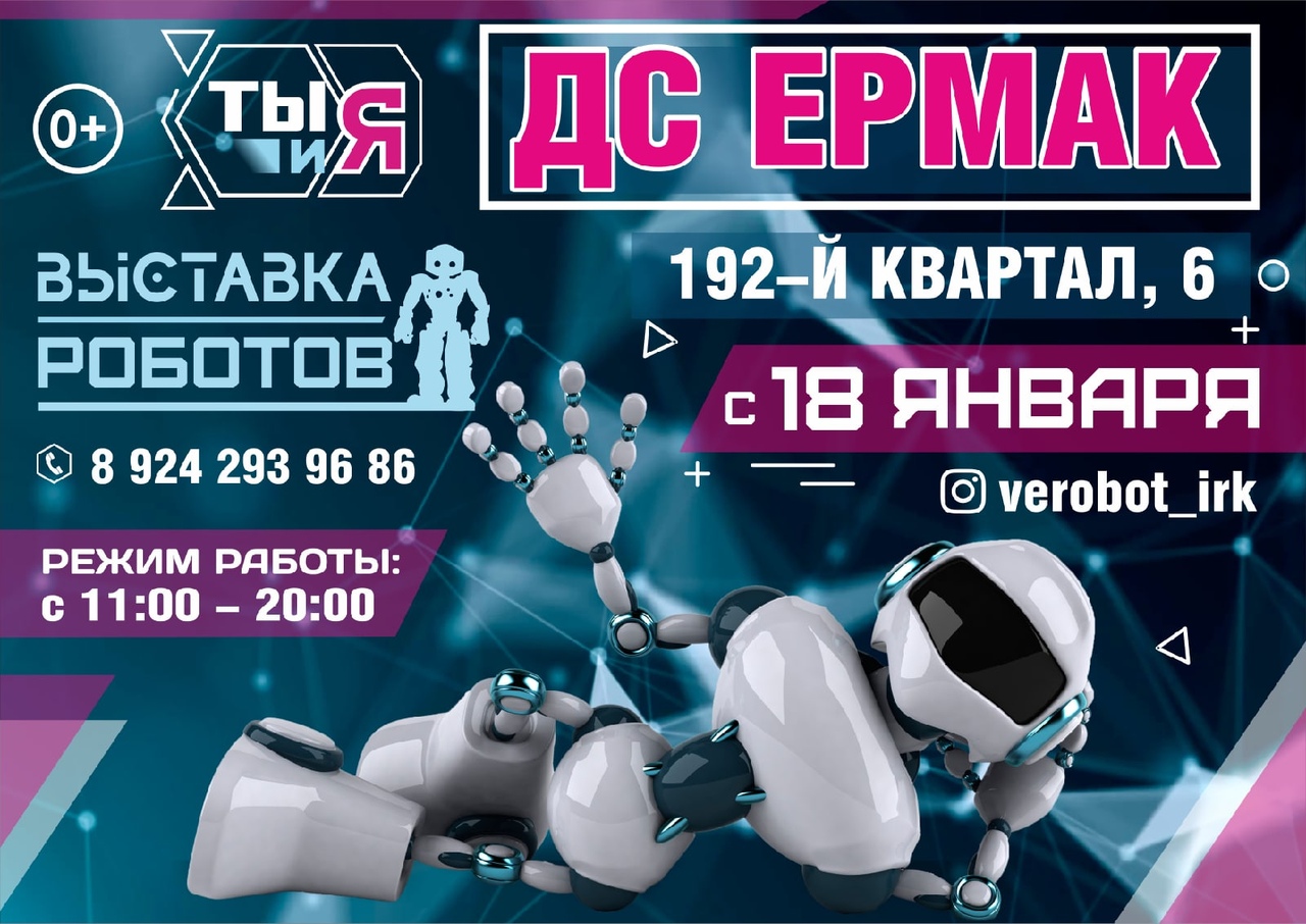 Выставка современных роботов пройдет в Ангарске с 18 января по 16 февраля во Дворце спорта "Ермак". На ней представлены умные машины разного размера - от 20 до 100 см. На выставке посетители смогут не только увидеть, но и попробовать управлять роботами через гаджеты и специальные пульты. Здесь же будут действовать различные интерактивные уголки для детей - зона с конструктором "Лего", рисовальный стол с 3D-ручками и многое другое. Стоимость билета - 250р. для взрослый и детей. Детям до 3-х лет бесплатно! Телефон для справок: 89242939686. Режим работы: ежедневно с 11:00 до 20:00, без выходных.