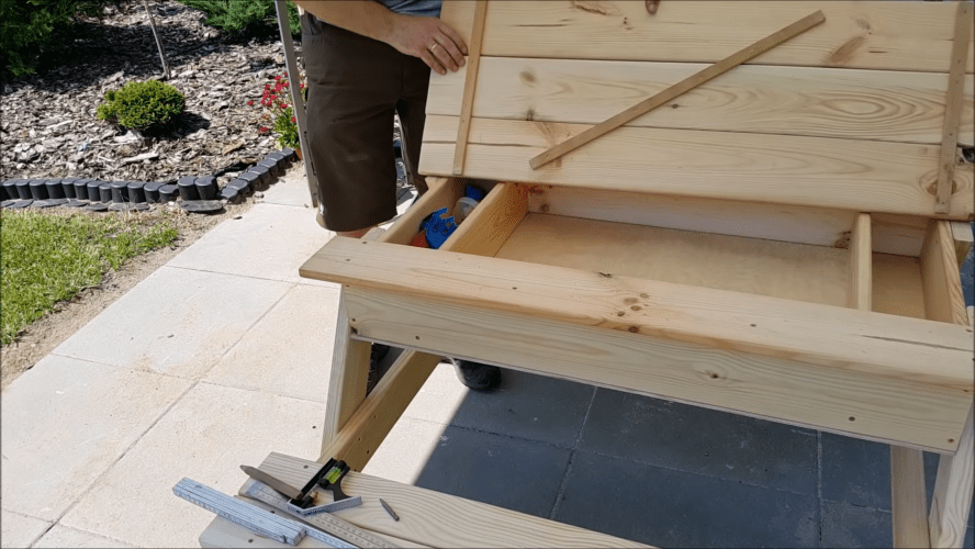 Крепим к коробу крайние доски столешницы. Состыковываем остальные доски столешницы, которые одновременно будут еще и съемной крышкой, переворачиваем их и скрепляем при помощи дополнительных реек.
