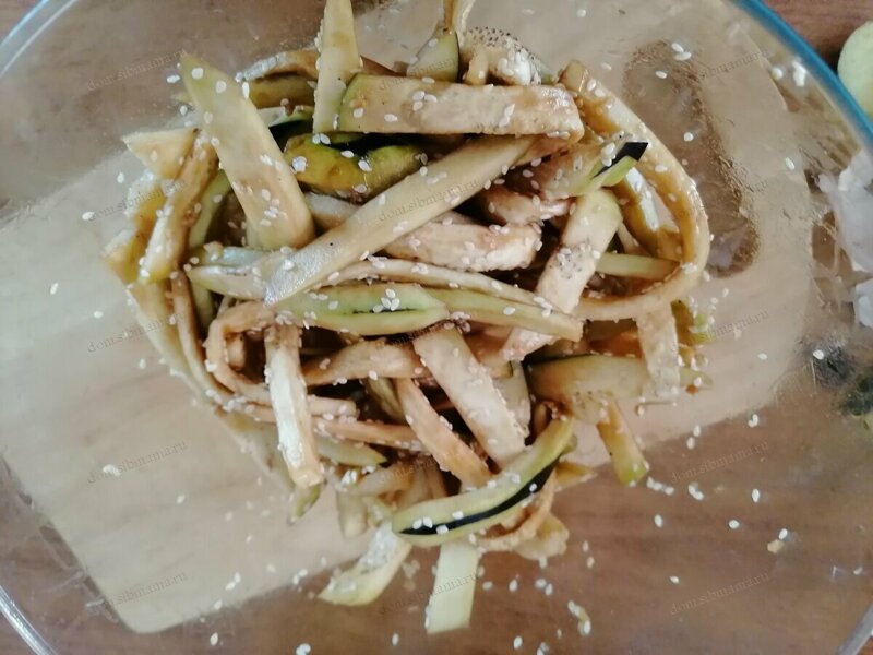 Теперь нужно обжарить полоски баклажанов на разогретом масле. Как только партия готова - складывать в чашку к салату.
