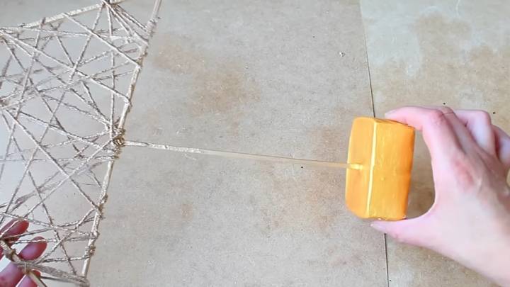 На следующий день оберните весь треугольник хаотично пряжей или верёвкой. Проклеивайте горячим клеем в некоторых местах, чтобы зафиксировать.