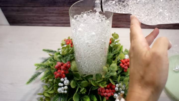 Внутрь новогоднего венка спрячьте светодиодную гирлянду. В стакан установите плавающую свечу.