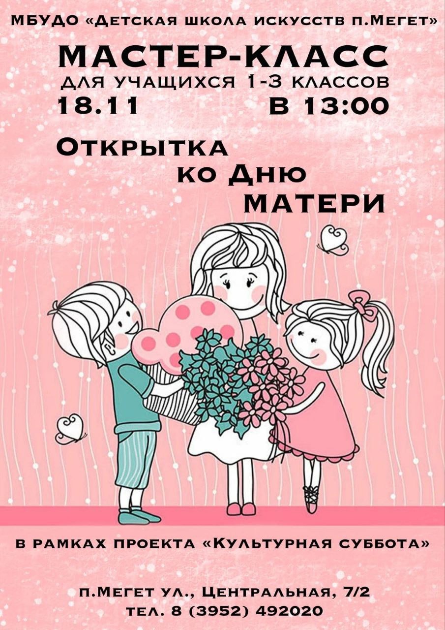 Детская школа искусств поселка Мегет приглашает 18 ноября в 13:00 на мастер-класс "Открытка ко Дню матери"