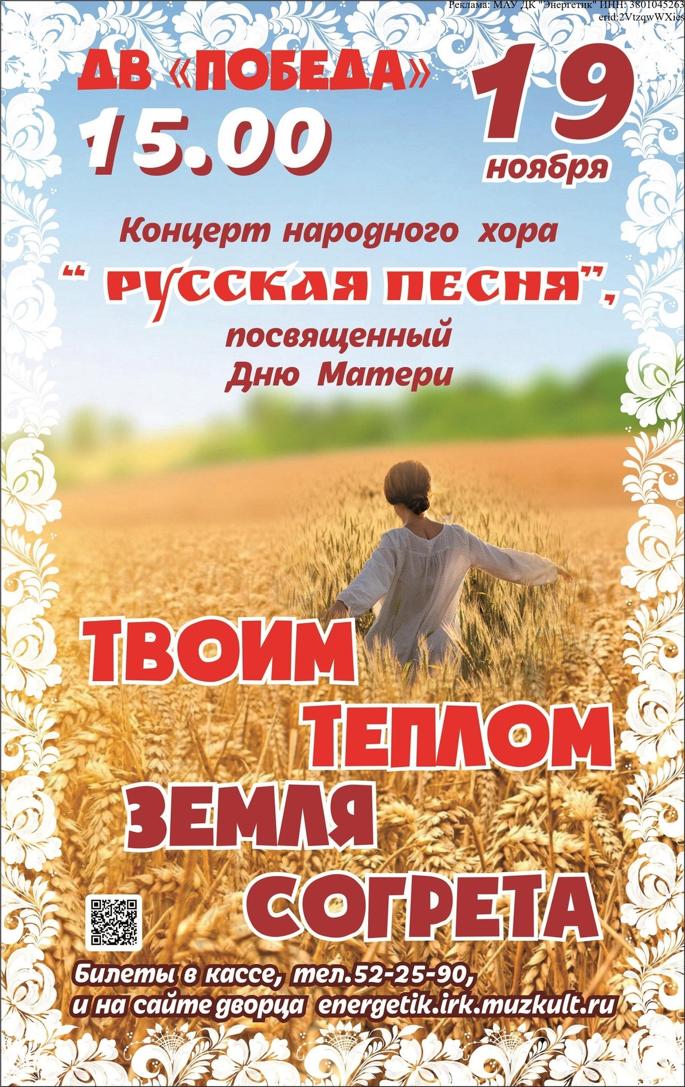 Приглашаем 19 ноября в 15:00 во Дворец ветеранов "Победа" на концерт Народного хора "Русская песня", посвященный Дню матери.