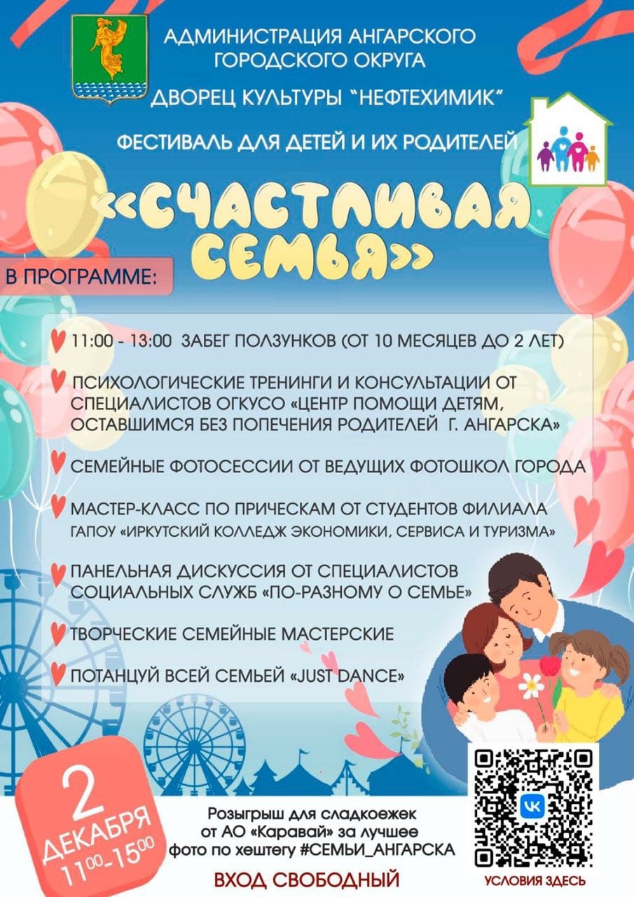 Фестиваль для детей и родителей «Счастливая семья» пройдет 2 декабря. В ДК «Нефтехимик» приглашают всех, кто заинтересован в формировании доброжелательных отношений в семье, хочет узнать что-то новое, полезное и интересное и отлично провести время в субботу с 11.00 до 15.00.