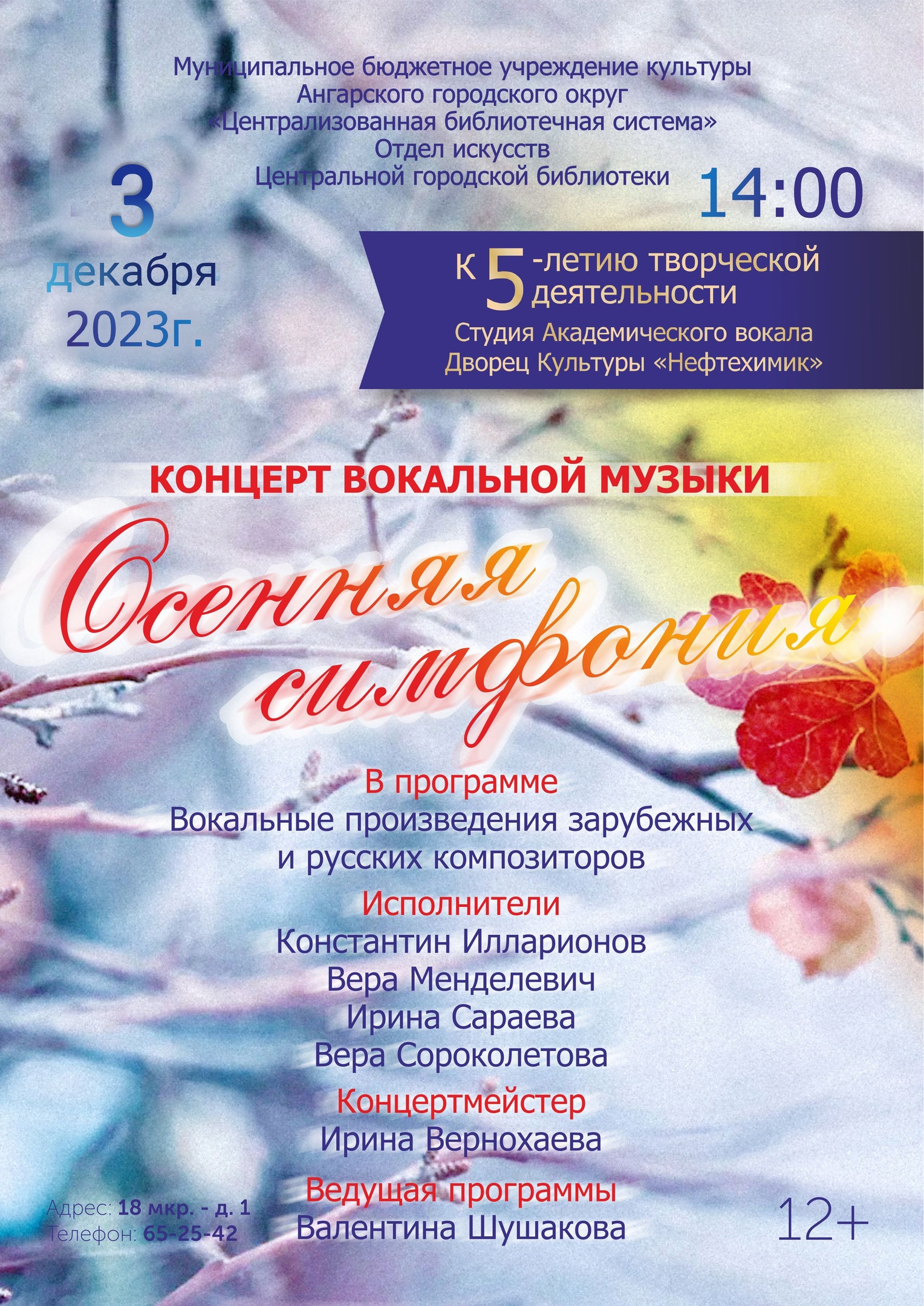 Приглашаем в отдел искусств Центральной городской библиотеки на концерт вокальной музыки «Осенняя симфония». В программе вокальные произведения зарубежных и русских композиторов.