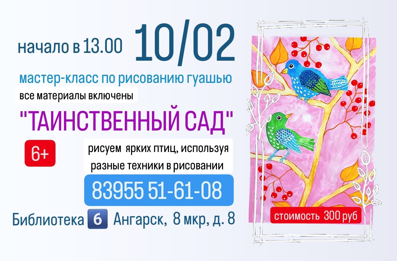 ДШИ №4 приглашает 10 февраля в 11:00 на мастер-класс "Пейзаж в миниатюре" (роспись по дереву). Купить билет можно по ссылке.