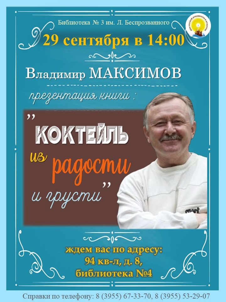 В последнее воскресенье сентября библиотека №3 им. Л. Беспрозванного приглашает всех желающих на творческую встречу и презентацию книги «Коктейль из радости и грусти» иркутского писателя Владимира Максимова.