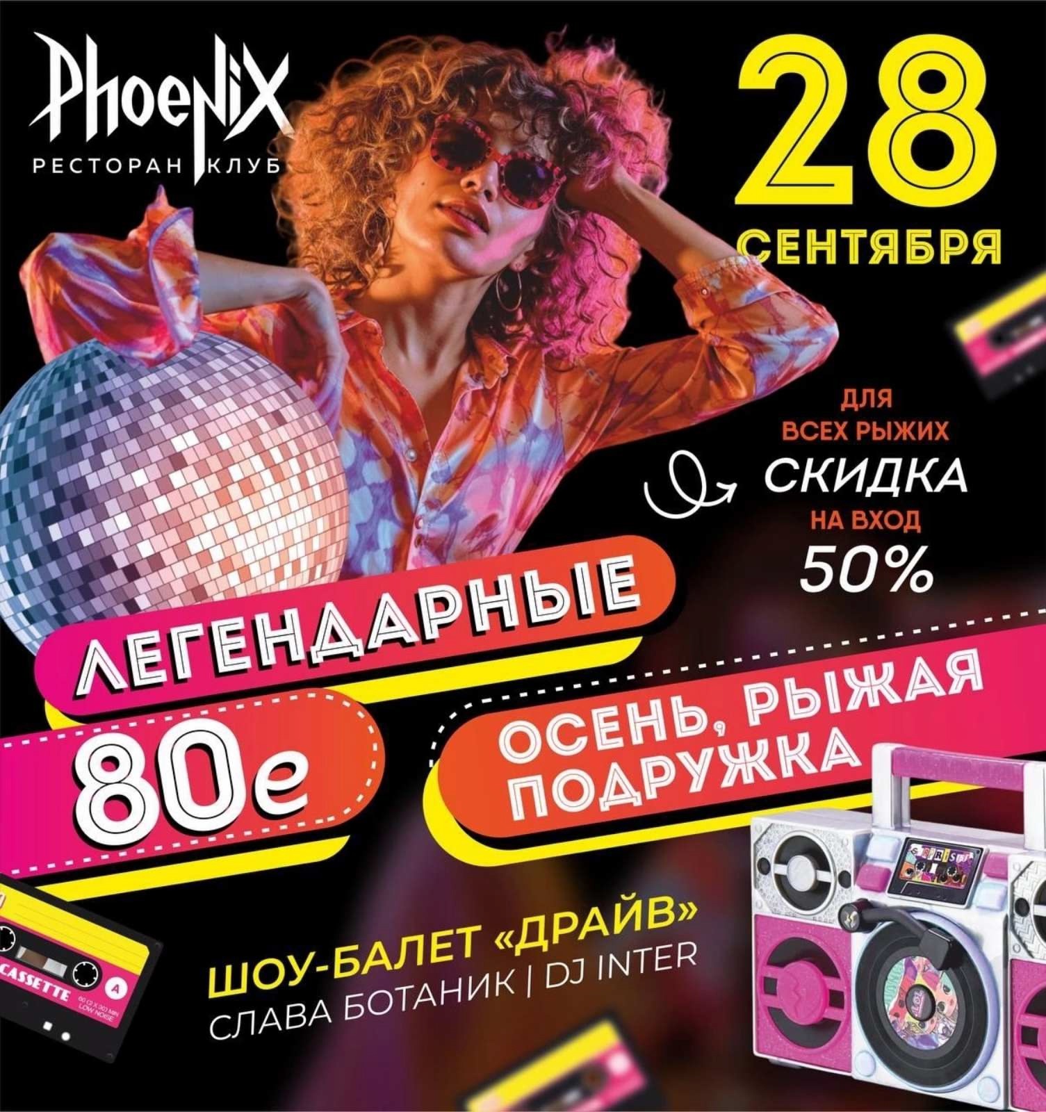 Клуб-ресторан "Phoenix" приглашает 28 сентября на незабываемую дискотеку в духе ярких 80-х «ОСЕНЬ, рыжая подружка!». Откройте для себя эпоху, когда музыка была настоящим искусством, а стиль — самовыражением!