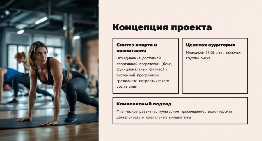 "Вектор Силы" – это молодежный центр развития, объединяющий спортивную подготовку (бокс, фитнес) с комплексной программой гражданско-патриотического воспитания. Проект создает среду, где через физическое совершенствование, культурное просвещение, волонтерство и социальные инициативы формируется новое поколение активных, здоровых и ответственных граждан, готовых вносить позитивный вклад в развитие нашего региона и страны.