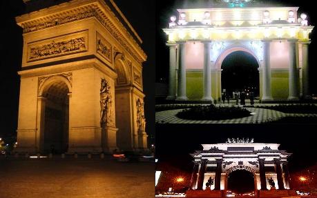 На сколько я знаю, все подобные арки строили для парадного победоносного шествия войск по возвращению с битв(воин) - назывались триумфальными(победными) арками...
