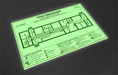 Но выполнятся планы эвакуации должны в соответствии с ГОСТ Р 12.2.143-2009 ССБТ «Системы фотолюминесцентные эвакуационные. Требования и методы контроля», который определяет планы эвакуации, как элемент фотолюминесцентной эвакуационной системы (ФЭС).