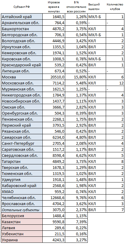 Ниже взяты 15 субъектов с большинством игрового времени. Из них только 3 не имеют команды КХЛ - это Самарская область (надеюсь со следующего сезона изменится), Пермский край и Пензенская область.